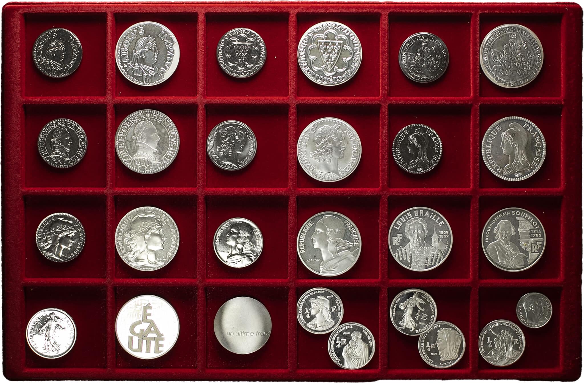 Dont de nombreuses monnaies commémoratives en argent de la Ve République BE (PROOF). Qualités diverses.