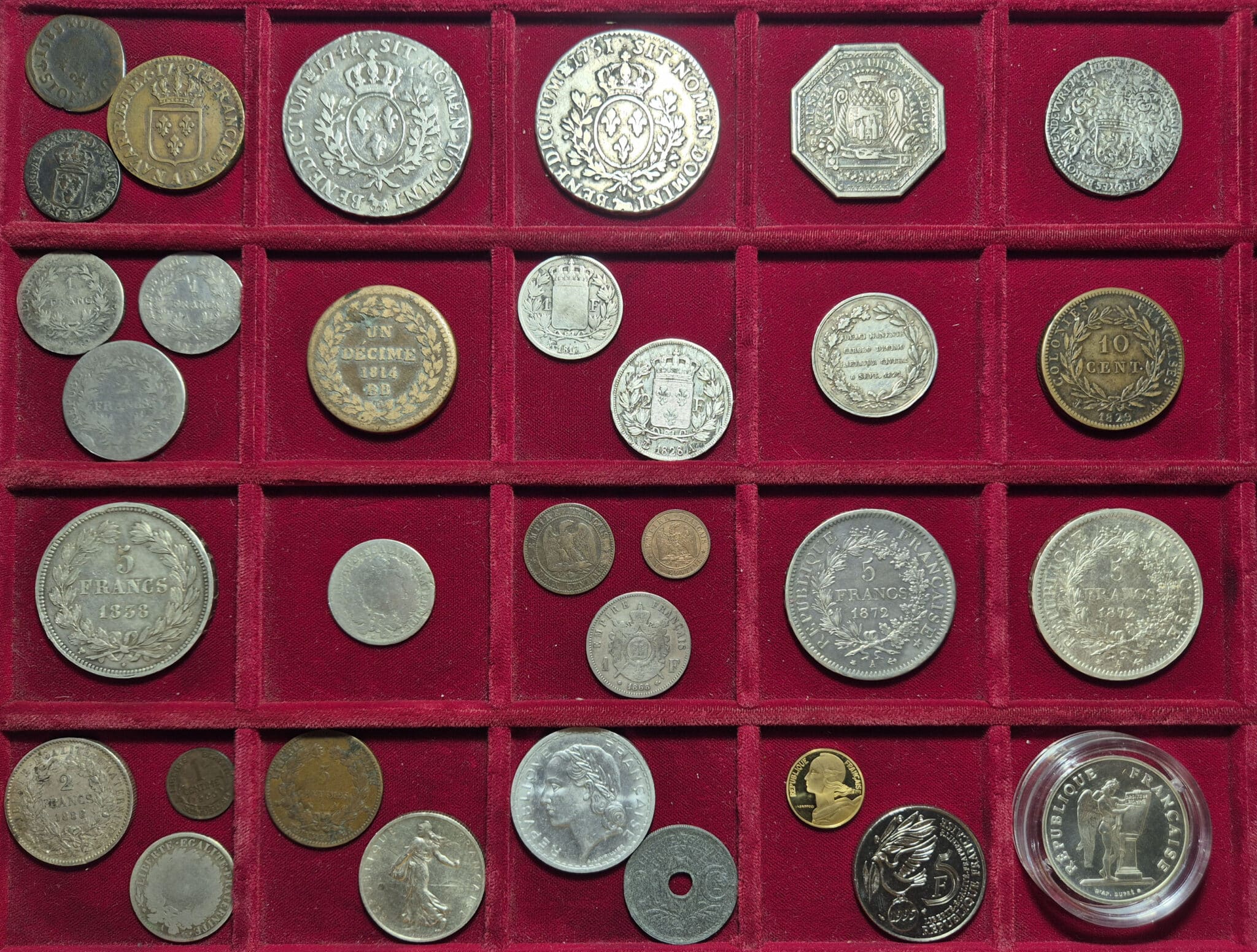 Henri III, double tournois 1588 S - Louis XIII, jeton 1642 Hubert Renée de Bussy (fonte postérieure ?) - Louis XV, liard 1720 BB, écu 1748 Béarn, écu 1751 Béarn - Louis XVI, sol 1791 A, jeton ville de Bordeaux - Napoléon Bonaparte, 1 franc An 12 A, An 12 K, 2 francs An 12 I, décime 1814 BB - Louis XVIII, 1 franc 1817 H - 2 francs 1828 A, jeton 1827 visite à Lille, 10 centimes 1829 A colonies - Louis-Philippe Ier, 5 francs 1838 MA - IIe République, 1 franc 1850 K - Napoléon III, 1 franc 1868 BB, 2 centimes 1854 D, 1 centime 1857 D - IIIe République, 5 francs 1872 A (2 ex.), 2 francs 1888 A, 1 francs 1872 A, 5 centimes 1896 A, 2 francs 1901, 1 centime 1900, 5 francs 1948 B, 20 centimes 1946 B - Ve République, 5 centimes 1996 BE, 5 francs 1995 ONU, 100 francs 1989 piéfort