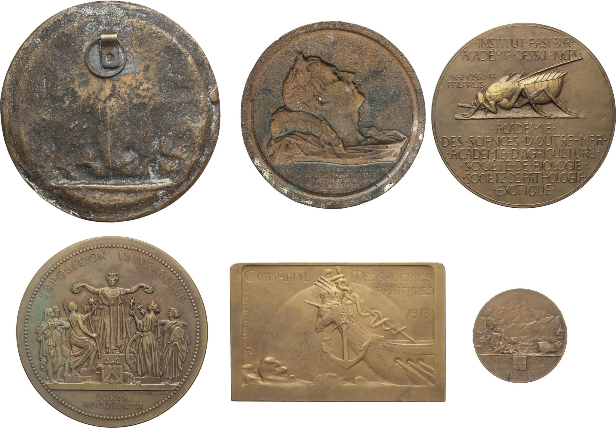 Prise de la Bastille 1789 (fonte uniface avec fixation, postérieure ?) - Retour des cendres de Napoléon Ier 1840 (galvanoplastie de l’avers) par Depaulis - Exposition universelle de Paris et le Prince impérial 1857 - Cinquantenaire de l’annexion de la Savoie à la France 1910 par Roch - La compagnie des messageries maritimes à André Lebon 1913 par Dautel - Emile Roubaud 1957 par Dropsy