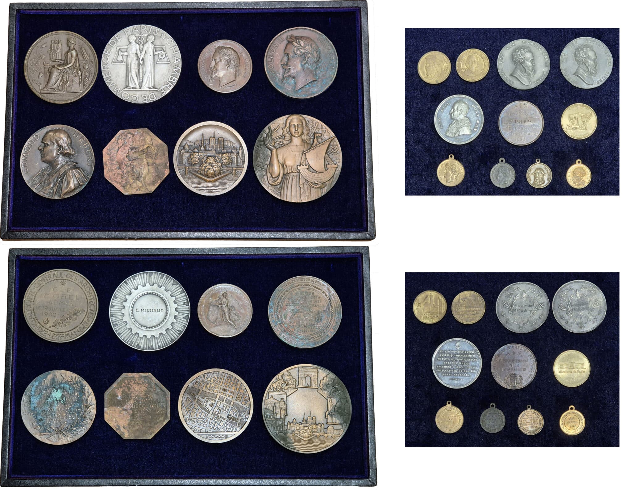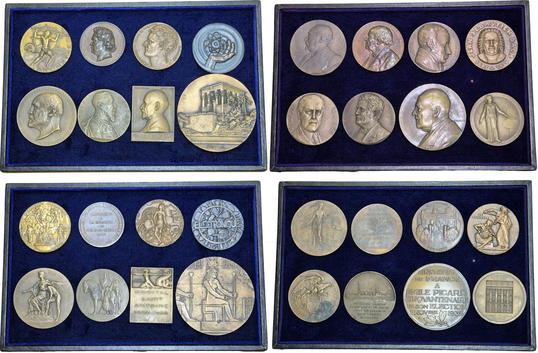 R. Baron : Prométhée - A. Barre : la Société de secours des amis des sciences à Louis Jacques Thénard 1858 - P. Belmondo : J. L. Barrault - Bernstein : Electronique - A. Boucher : Docteur Henri Huchard 1903 - P. M. Dammann : Général Gouraud, Paul Le Noir - M. Delannoy : Philae - L. Deschamps : Emile Combes - A. Dubois : Henri Emile Edwards - A. Hebremont : Theophile Hyacinthe - A. Landry : Jean Sébastien Bach - J. P. Legastelois : Woodrow Wilson, Myron T. Herrick - P. A. Morlon : Emile Picard - H. Niclausse : l’Union incendie - E. A. Oudiné : Société centrale des architectes - P. M. Poisson : Chambre de commerce de Paris - H. Ponscarme : Exposition universelle de Paris 1867 (petit module), Société historique et archéologique de la Charente à Angoulême - P. Tasset : Edmond Hébert - P. Turin : Exposition des arts décoratifs 1925, Ville de Paris 1927, Ville de Paris - Divers (11)