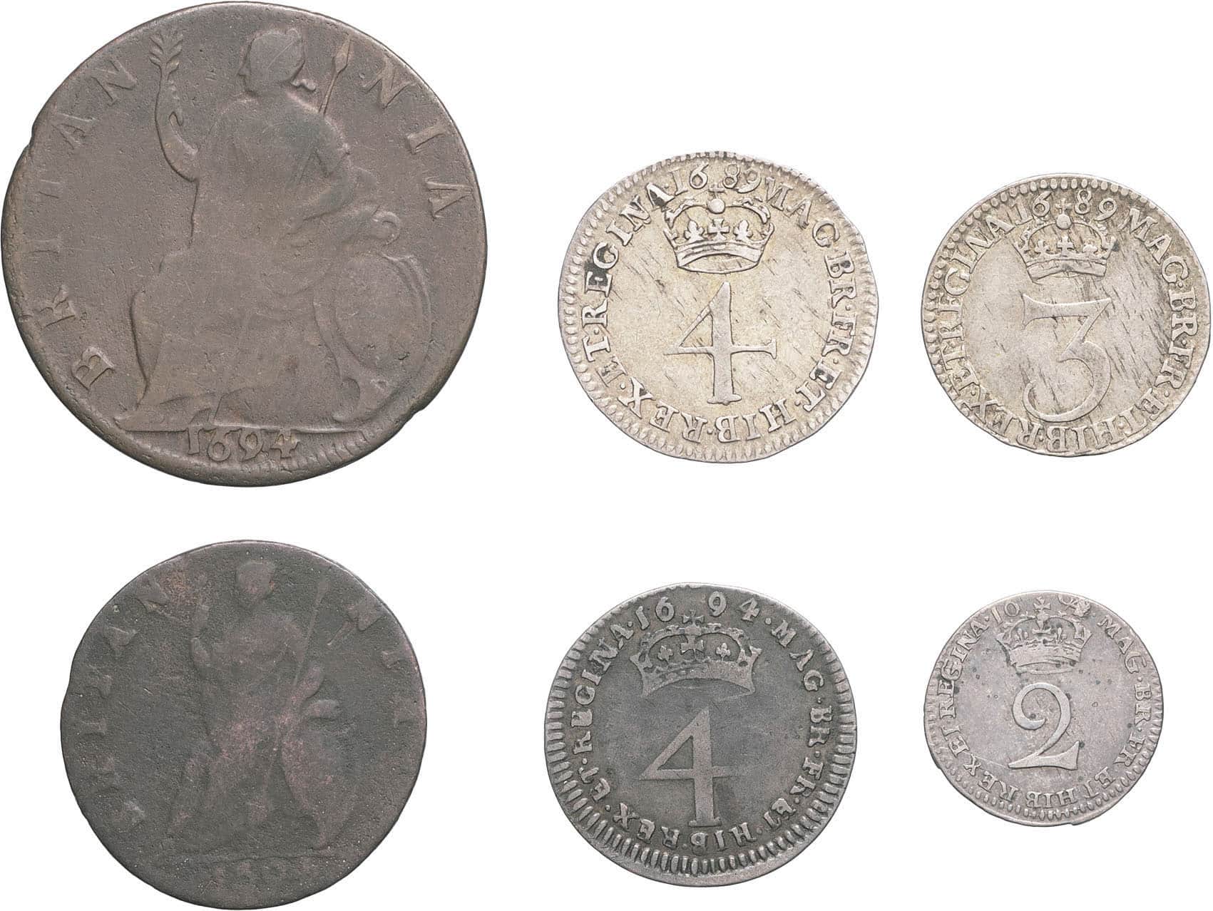 - UNITED KINGDOM Guillaume et Marie (1689-1694). Lot de 6 monnaies, Londres.