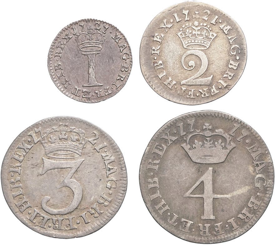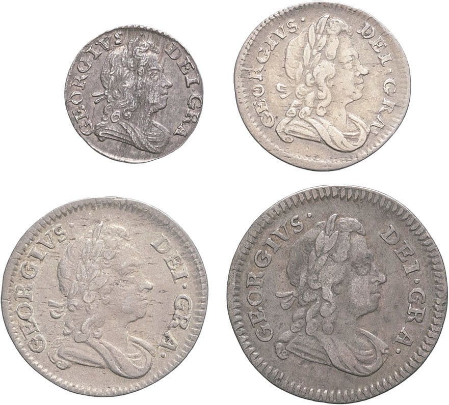 - UNITED KINGDOM Georges Ier (1714-1727). Série de 4 à 1 pence, maundy money 1717 à 1727, Londres.