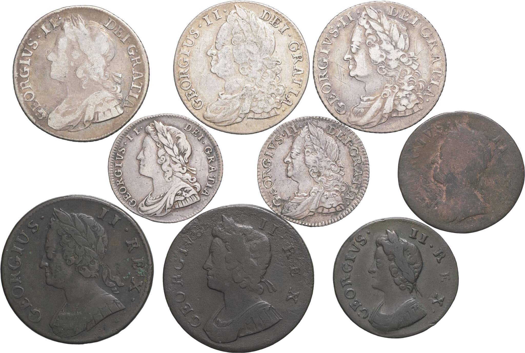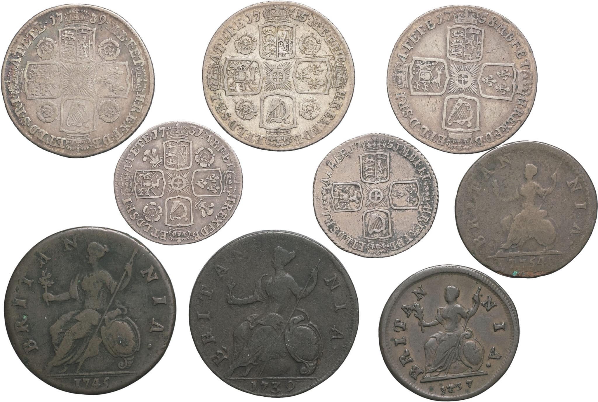 - UNITED KINGDOM Georges II (1727-1760). Lot de 9 monnaies, Londres.