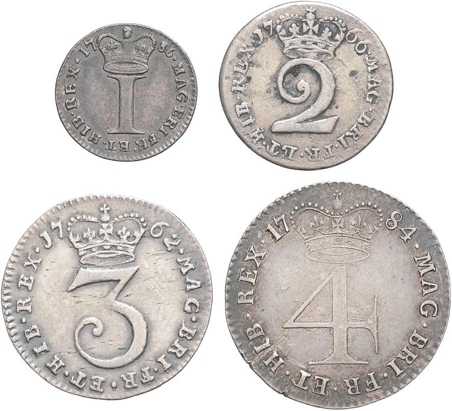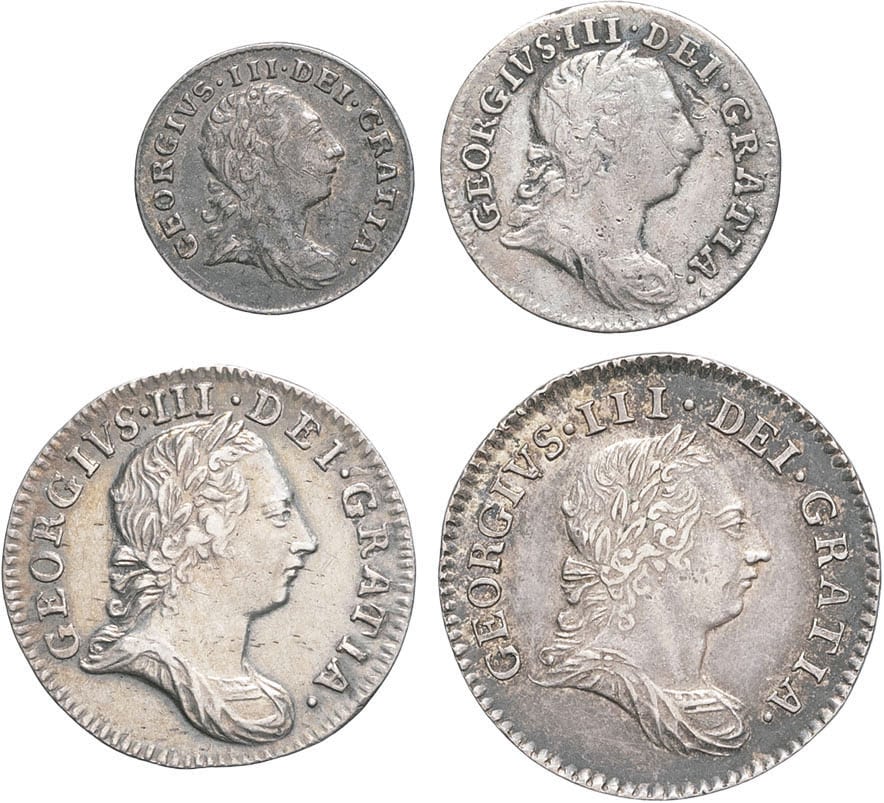 - UNITED KINGDOM Georges III (1760-1820). Série de 4 à 1 pence, maundy money 1762 à 1786, Londres.