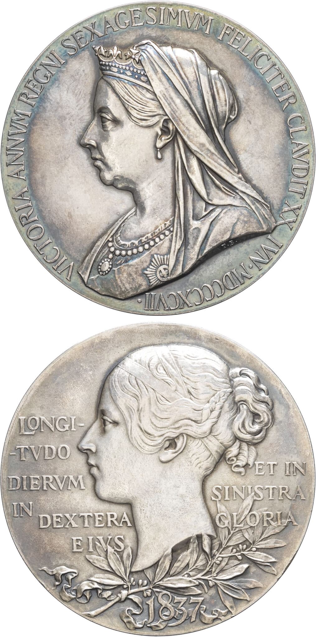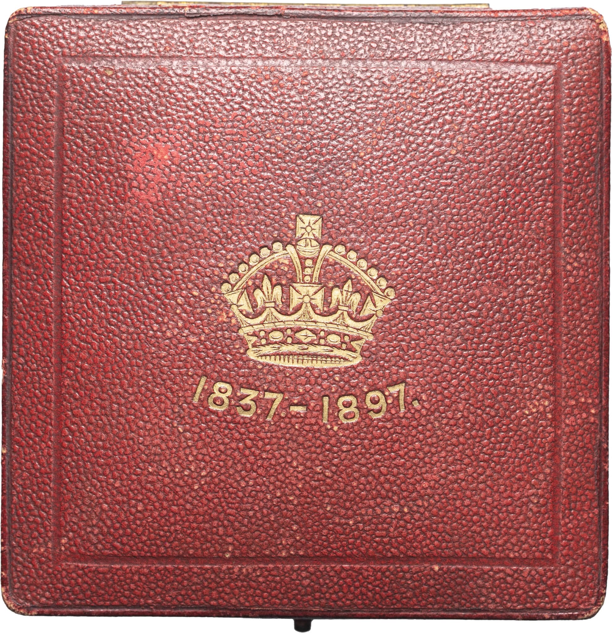 Av. VICTORIA ANNVM REGNI SEXAGESIMVM FELICITER CLADVIT XX IVN. MDCCCXCVII. Buste voilé et couronné à gauche ; signature T. B.