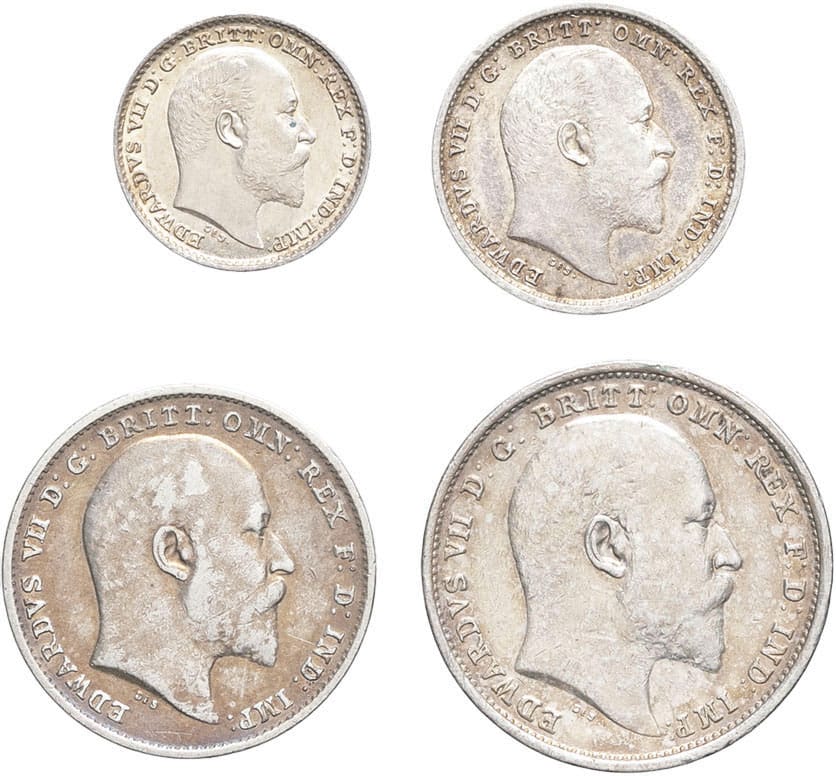 - UNITED KINGDOM Édouard VII (1901-1910). Série de 4 à 1 pence, maundy money 1902 à 1904, Londres.