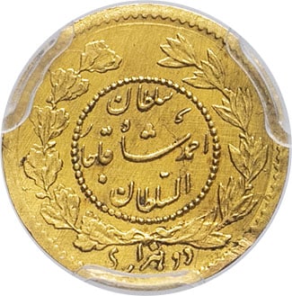 - Ahmad Chah Qadjar (1909-1925). 1/5 toman ou 2000 dinars AH 1332 (1913), Téhéran.