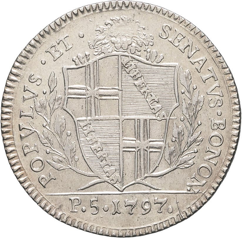 - ITALY Bologne, République bolonaise (1796-1797). Demi écu ou 5 paoli (mezzo scudo) 1797, Bologne.