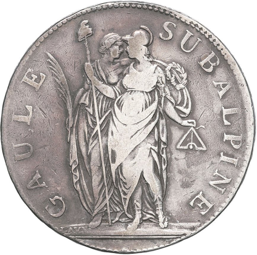 Av. GAULE SUBALPINE. La Gaule subalpine, tenant une palme et une couronne, et la France casquée, tenant une pique surmontée d’un bonnet de la Liberté et un niveau ; signature LAVY.