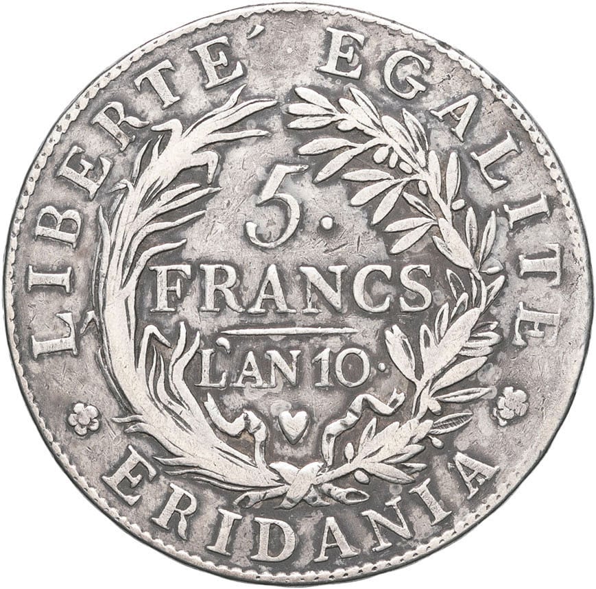 Rv. LIBERTÉ EGALITÉ/ *ERIDANIA*. Couronne formée d'une palme et d'une branche de laurier, au centre 5 FRANCS L'AN (date) et (cœur).