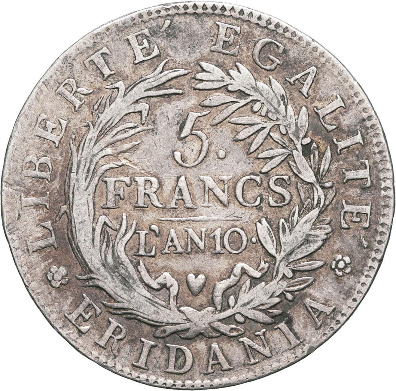 Rv. LIBERTÉ EGALITÉ/ *ERIDANIA*. Couronne formée d'une palme et d'une branche de laurier, au centre 5 FRANCS L'AN (date) et (cœur).