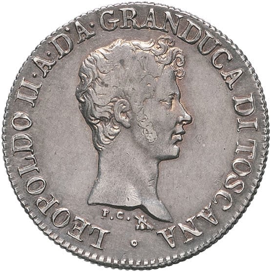 Av. LEOPOLDO. II. A. D’A. GRANDUCA DI TOSCANA. Tête nue à droite, au-dessous signature P. G. et (différent).