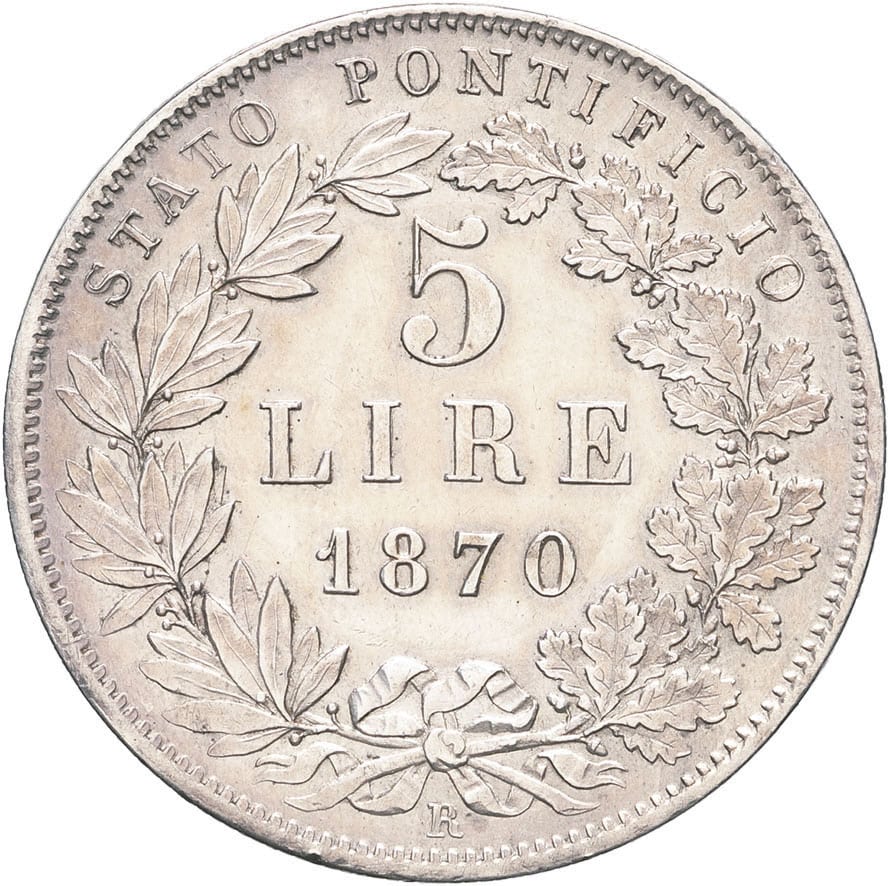 - ITALY Vatican, Pie IX (1846-1878). 5 lire 1870 - An XXV, R, Rome.