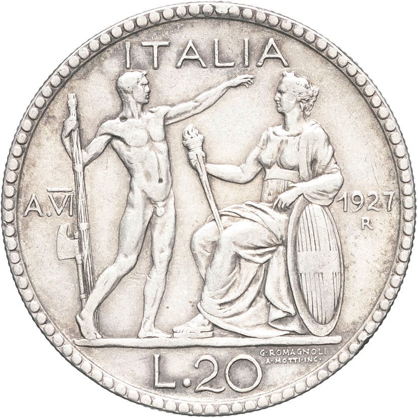 Rv. ITALIA. L’Italie assise à gauche et tenant une torche. Face à elle, un licteur, nu, avec un faisceau et saluant. À gauche, A. (date) ; à droite, (date) et (atelier) ; à l’exergue L. 20 et signature G. ROMAGNOLI A. MOTTI INC.