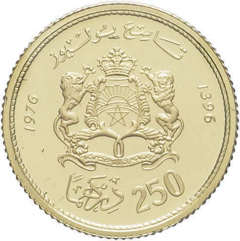- MOROCCO Hassan II (1961-1999). 250 dirhams Or, anniversaire du roi, Flan bruni (PROOF) 1976 - AH 1396, Llantrisant.