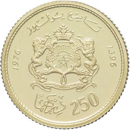 - MOROCCO Hassan II (1961-1999). 250 dirhams Or, anniversaire du roi, Flan bruni (PROOF) 1976 - AH 1396, Llantrisant.