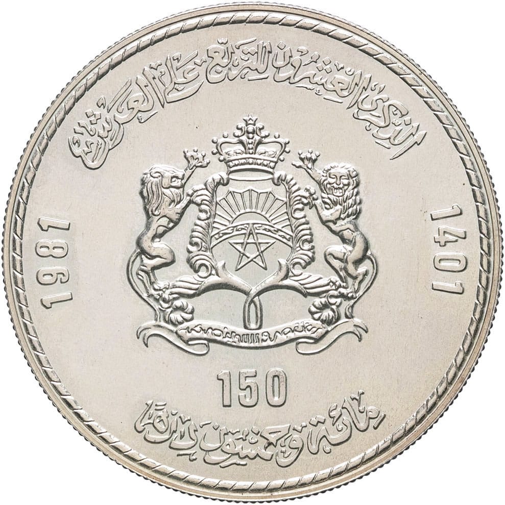 - MOROCCO Hassan II (1961-1999). 150 dirhams, 20e anniversaire du couronnement 1981 - AH 1401.
