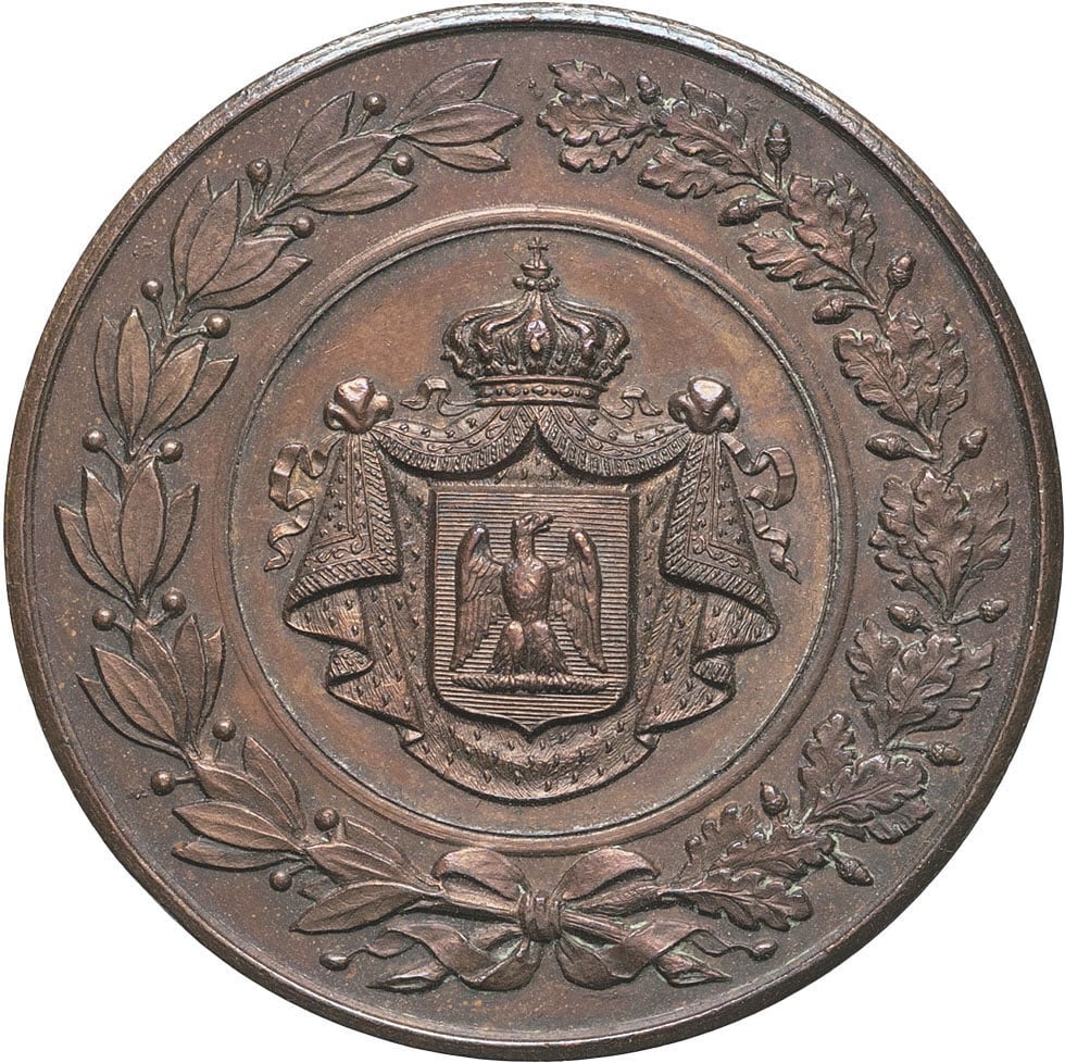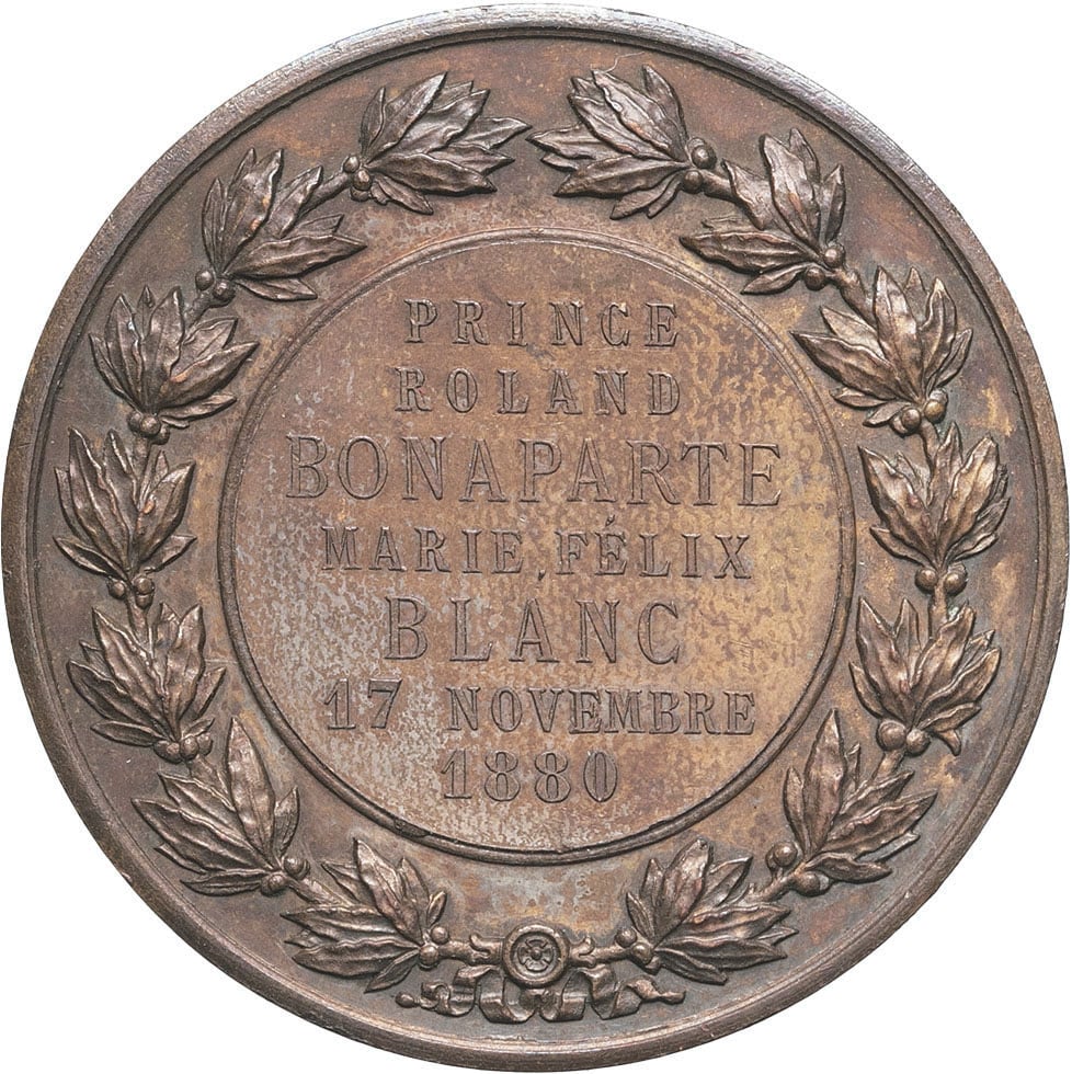 Rv. Dans une couronne formée de deux branches de laurier, dans le champ, en sept lignes : PRINCE / ROLAND / BONAPARTE / MARIE, FÉLIX / BLANC / 17 NOVEMBRE / 1880.