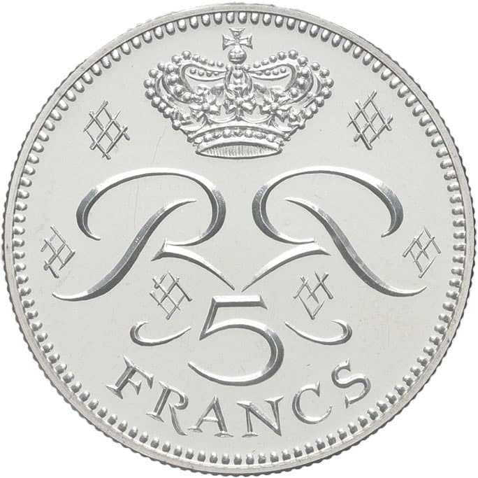 - Rainier III (1949-2005). Essai de 5 francs en argent 1974, Paris.