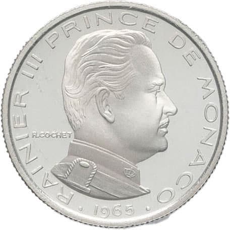 - Rainier III (1949-2005). Essai du 1/2 franc en argent, frappe sur flan bruni (PROOF) 1965, Paris.