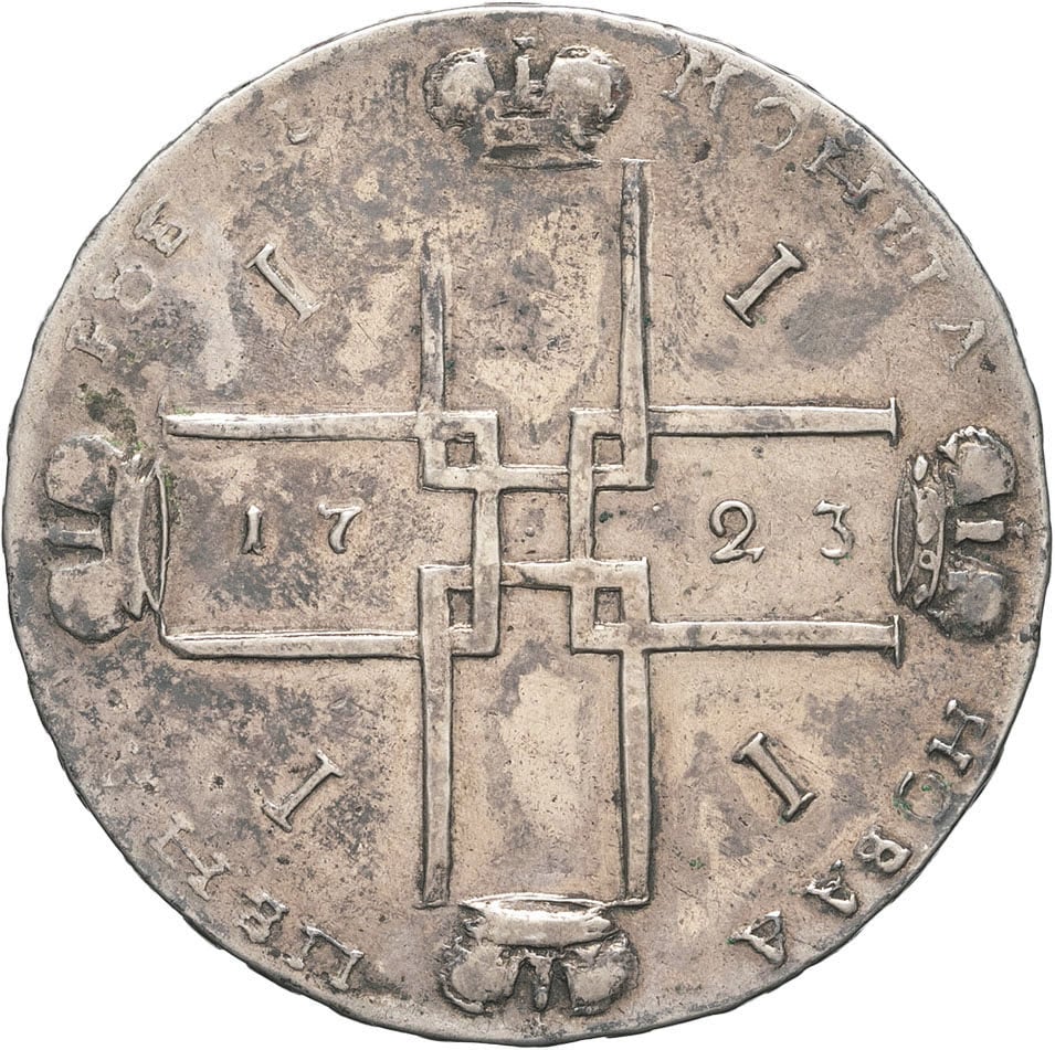 Rv. Légende en cyrillique. Croix formée de quatre П, cantonnée de quatre I ; (date) dans la croix.
