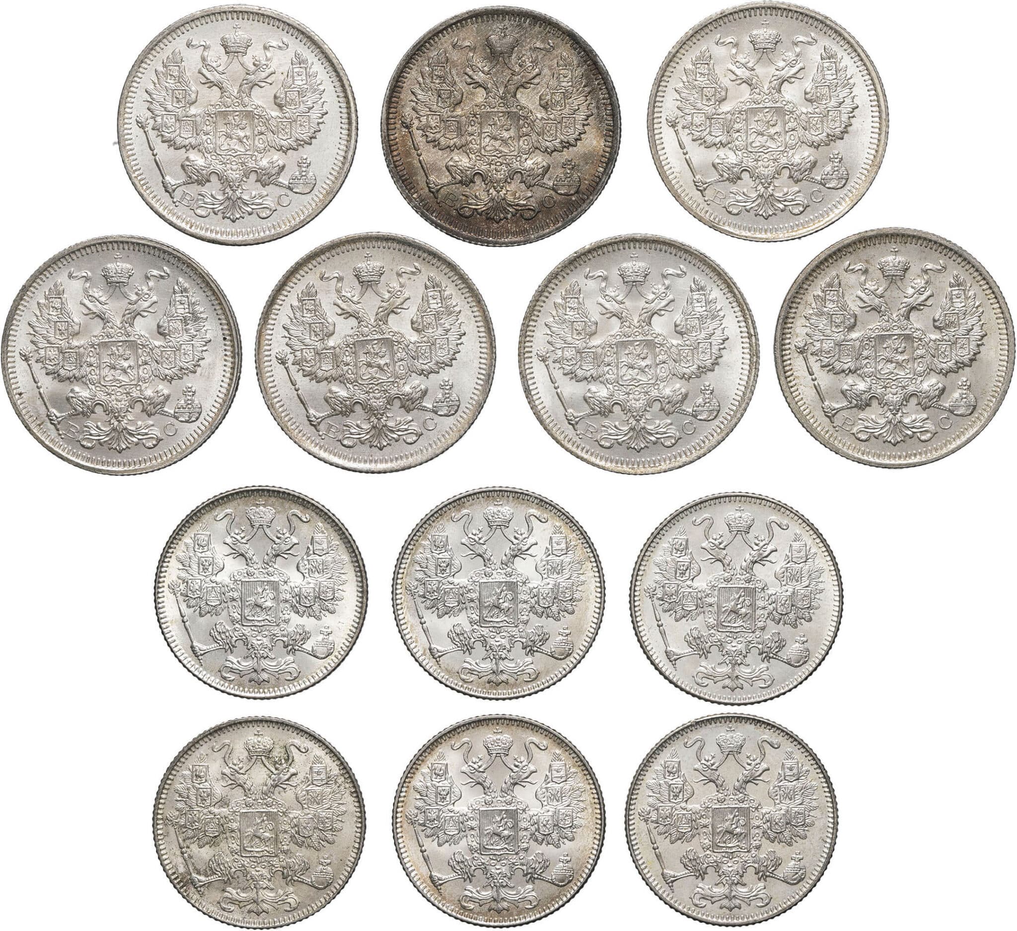 - RUSSIA Nicolas II (1894-1917). Lot de 13 monnaies de 15 et 20 kopeks 1916, Saint-Pétersbourg.
