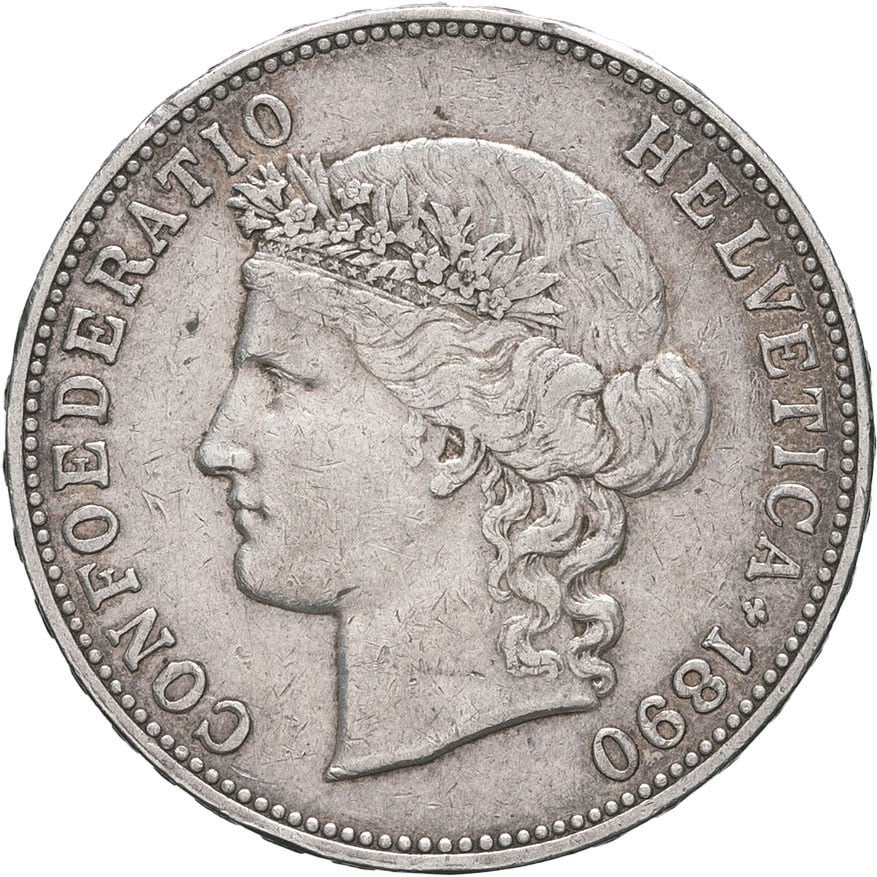 - SWITZERLAND Confédération Helvétique (1848 à nos jours). 5 francs, tête d’Helvetia 1890, B, Berne.