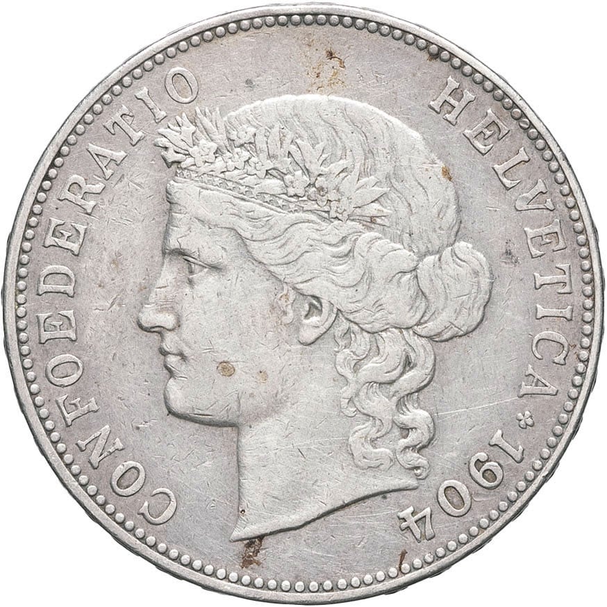 - SWITZERLAND Confédération Helvétique (1848 à nos jours). 5 francs, tête d’Helvetia 1904, B, Berne.