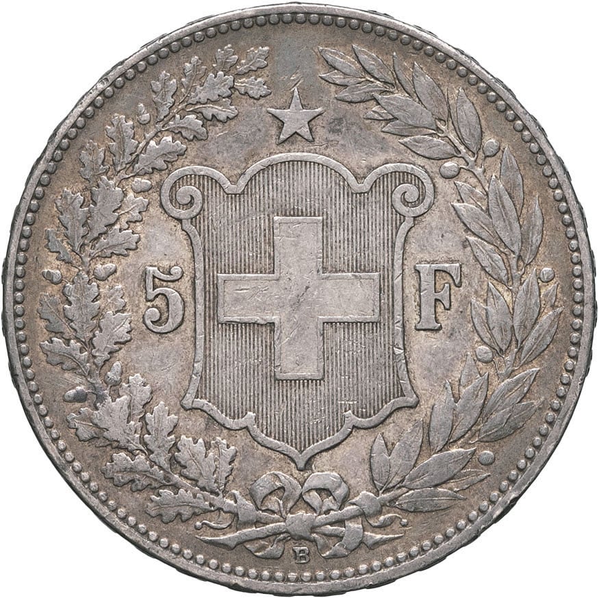 - SWITZERLAND Confédération Helvétique (1848 à nos jours). 5 francs, tête d’Helvetia 1908, B, Berne.