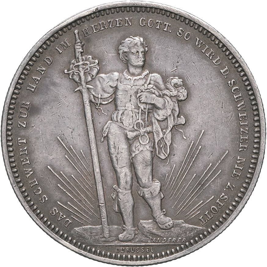 Av. DAS SCHWERT ZUR HAND IM HERZEN GOTT. SO WIRD D. SCHWEIZER NIE Z. SPOTT. Garde suisse de face appuyé sur la longue épée, au-dessous LANDERER ; signature DURUSSEL.