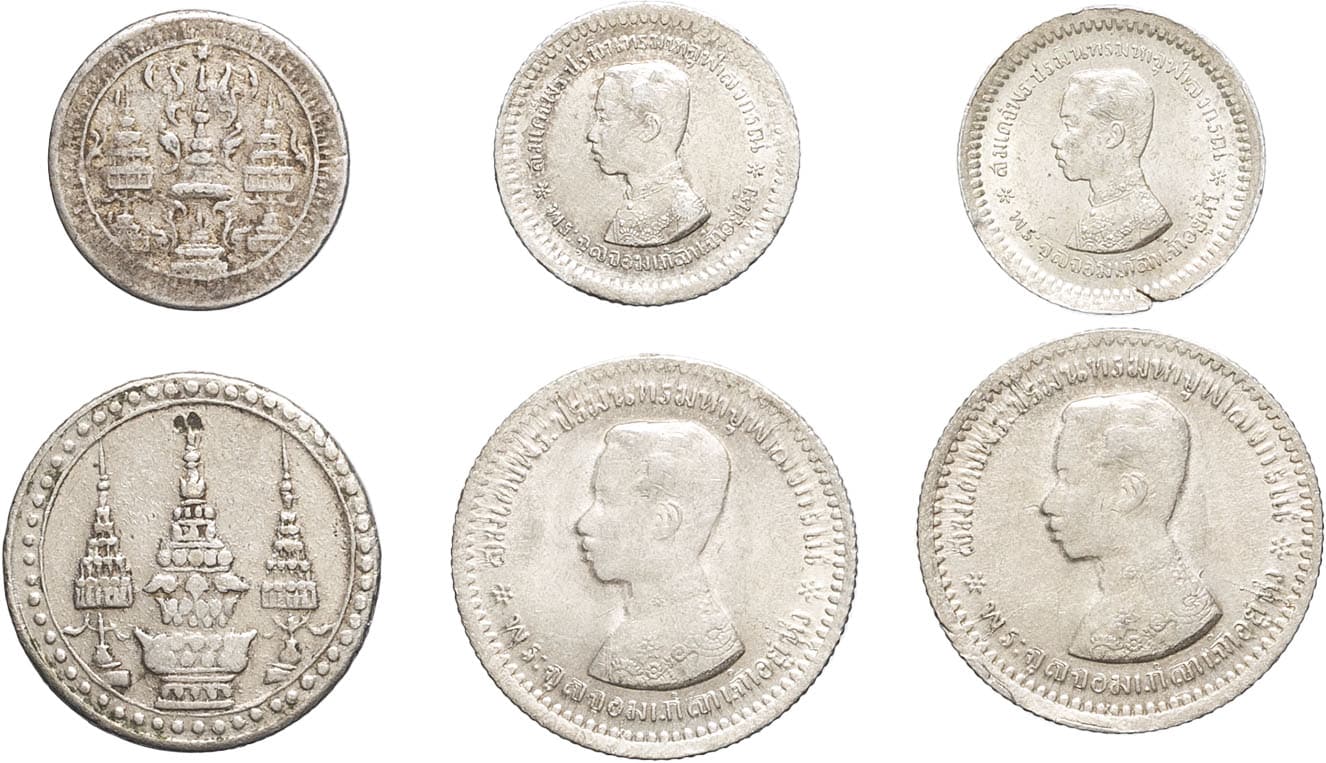1/4 baht ou salung ND (1869) - 1/8 baht ou fuang ND (1860) - 1/4 baht ND (1876-1900) (2 ex.) - 1/8 baht ND (1876-1900) (2 ex.). TTB à Superbe.