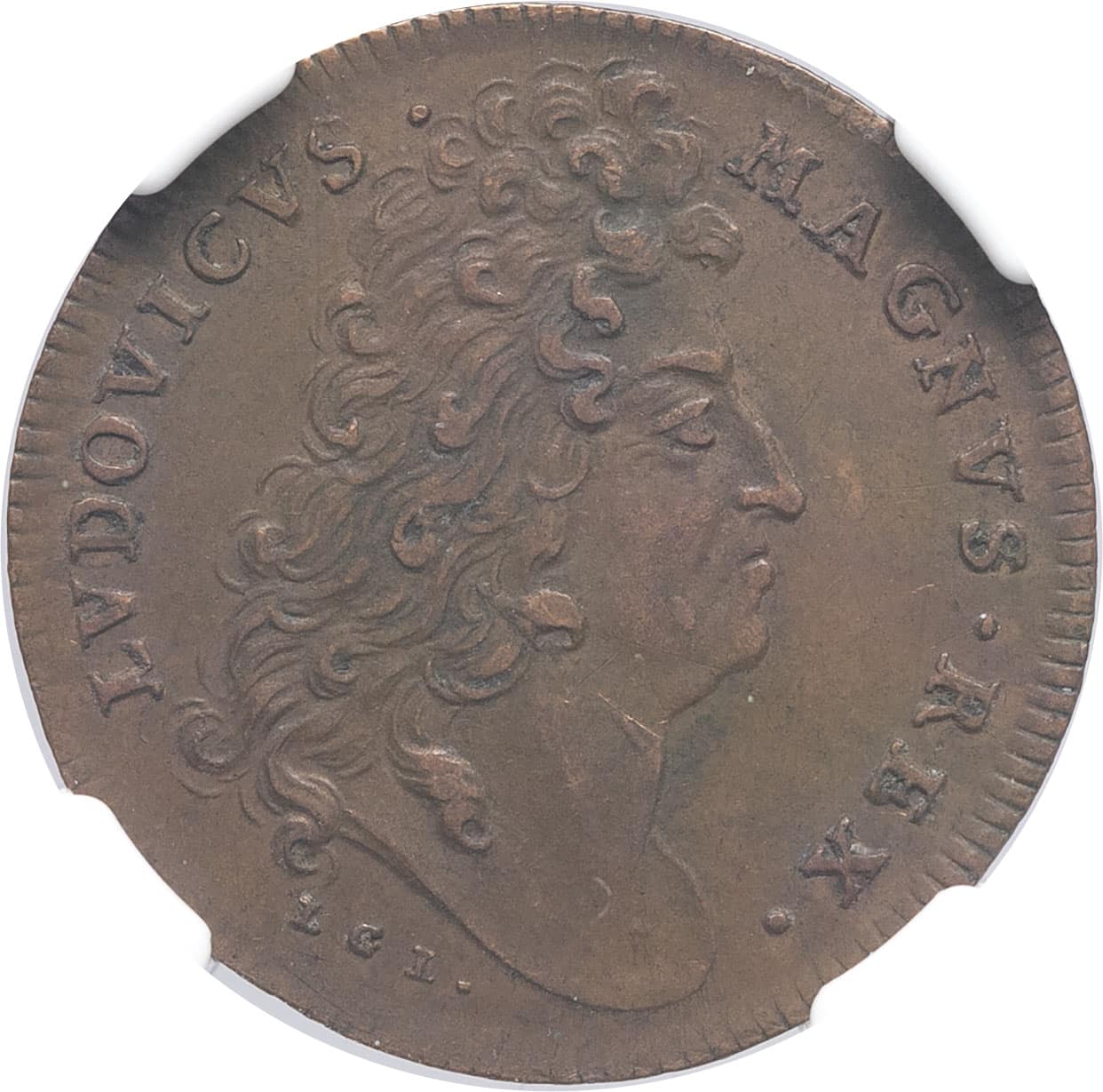 Av. LVDOVICVS. MAGNVS. REX. Tête de Louis XIV à droite avec la grande perruque, signature L G L.