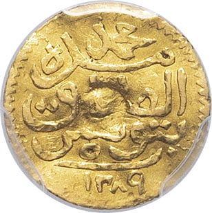 - TUNISIA Mohamed el-Sadik, Bey (1859-1882). 5 piastres AH 1289 (1866), Tunis.