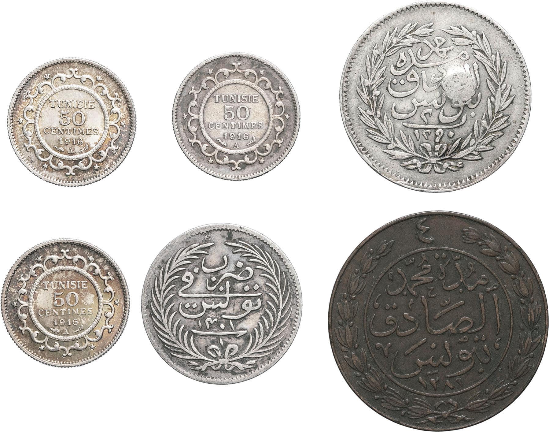 4 kharoub 1281 - 1 riyal 1290 (contremarqué) - 1/2 riyal 1301 - 50 centimes 1916 (3ex.)