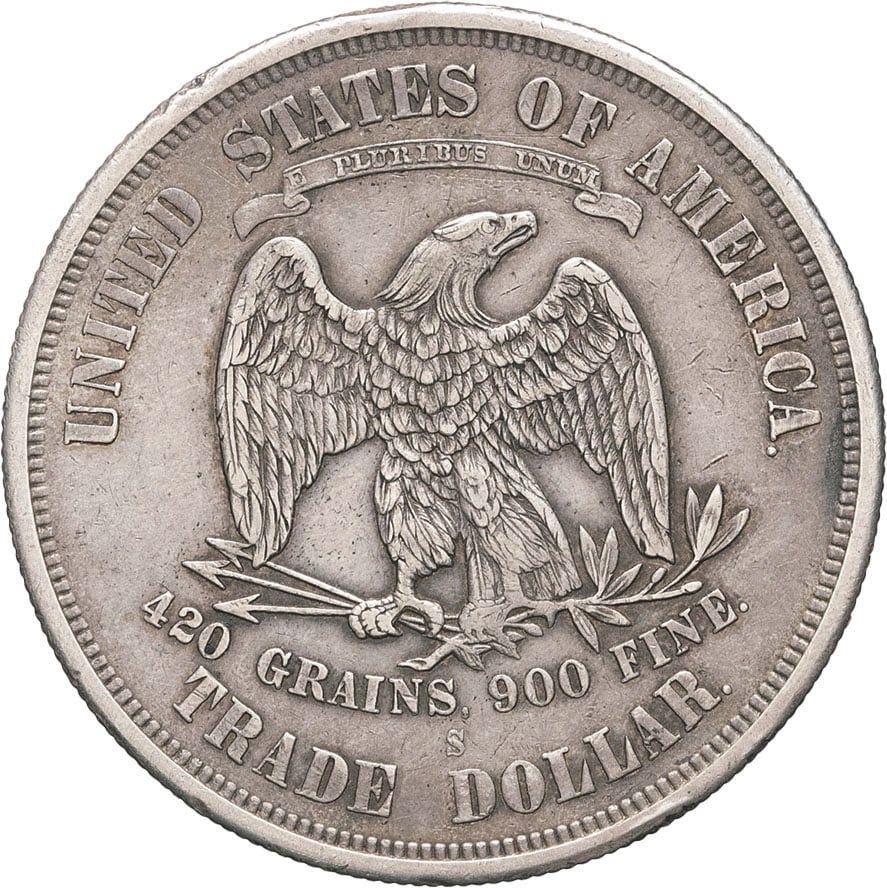 Rv. UNITED STATES OF AMERICA/ TRADE DOLLAR. Aigle éployée à gauche, tête à droite, sur une branche d’olivier et trois flèches en sautoir. Au-dessus, banderole inscrite E PLURIBUS UNUM. Au-dessous 420 GRAINS, 900 FINE et (atelier).