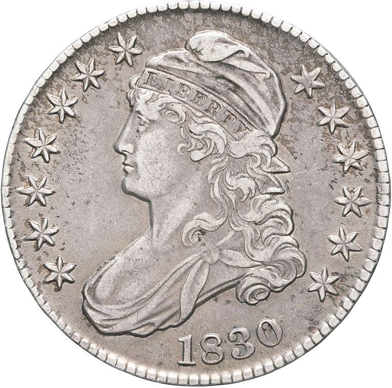 - UNITED STATES OF AMERICA République fédérale des États-Unis d’Amérique (1776-à nos jours). 50 cents, buste coiffé, tranche inscrite (capped bust half dollar, lettered edge) 1830, Philadelphie.