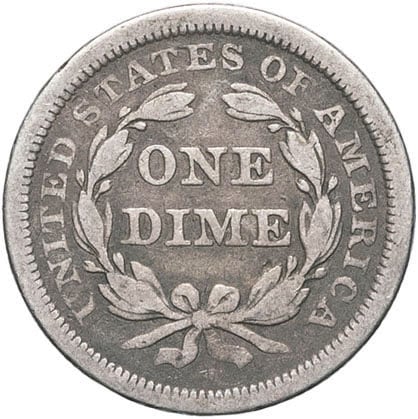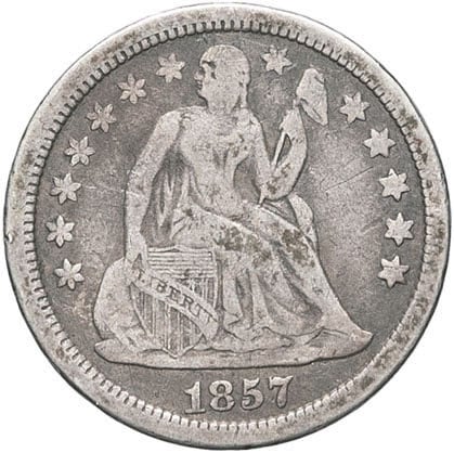 - UNITED STATES OF AMERICA République fédérale des États-Unis d’Amérique (1776-à nos jours). One dime, Liberté assise, étoiles à l’avers (Liberty seated dime, stars obverse) 1857, Philadelphie.