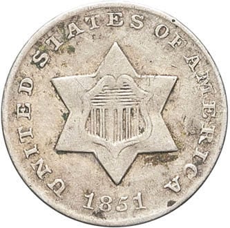 - UNITED STATES OF AMERICA République fédérale des États-Unis d’Amérique (1776-à nos jours). 3 cents, petite étoile (three cents, small star) 1851, Philadelphie.