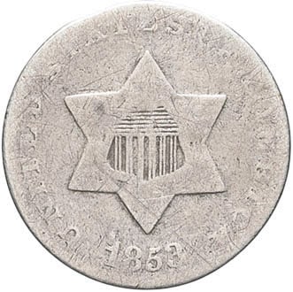 République fédérale des États-Unis d’Amérique (1776-à nos jours). 3 cents, petite étoile (three cents, small star) 1853, Philadelphie.