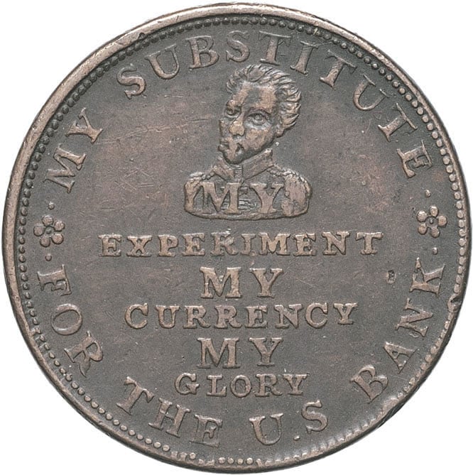 - UNITED STATES OF AMERICA République fédérale des États-Unis d’Amérique (1776-à nos jours). Jeton au module d’un cent, politique d’Andrew Jackson 1834, Waterbury (Scovill mint).