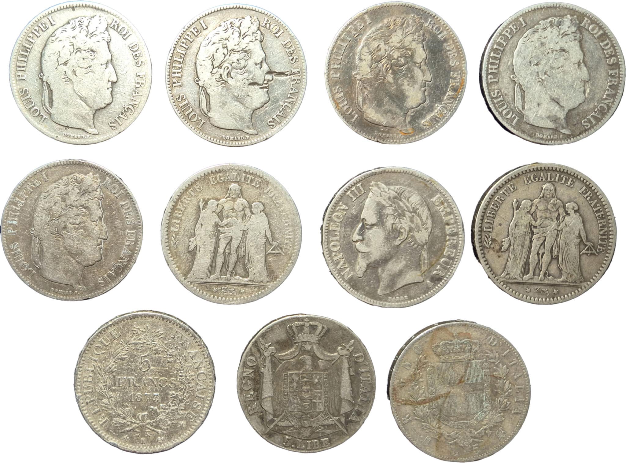 France : Louis-Philippe Ier, 5 francs 1833 W, 1834 B (2 ex.), 1834 K, 1843 K - IIe République, 5 francs 1849 A - Napoléon III / Second empire : 5 francs 1868 BB - IIIe République, 5 francs 1873 A (2 ex.) - Italie : Napoléon Ier, 5 lire 1808 M - Victor-Emmanuel I : 5 lire 1875 M