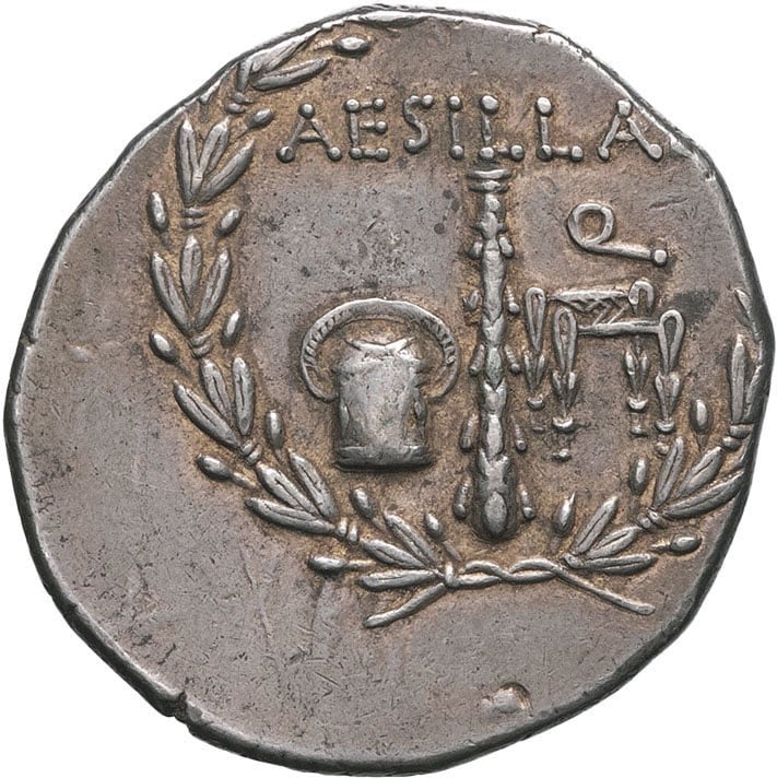 Rv. AESILLAS. Dans une couronne de laurier, massue entre la caisse et la chaise du préteur ; lettre Q dans le champ.