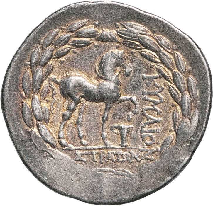 Rv. KYMAIΩN / KAΛΛIAΣ. Cheval bridé debout à droite, la jambe antérieure levée, un vase sous celle-ci ; le tout dans une couronne de laurier.