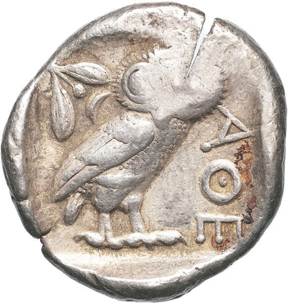 Rv. AΘE. Chouette debout à droite, regardant de face.