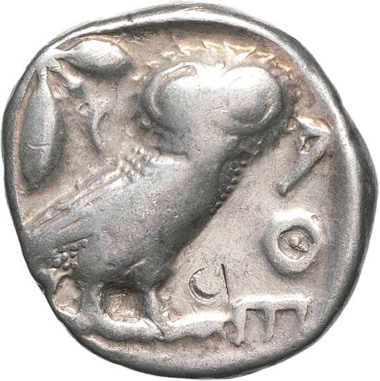 Rv. AΘE. Chouette debout à droite, regardant de face.