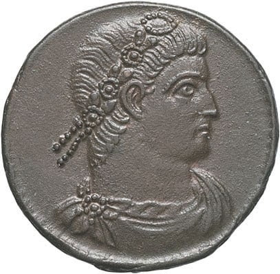 Cette monnaie est rattachée aux funérailles d’Hélène. Patine marron homogène. Superbe.
