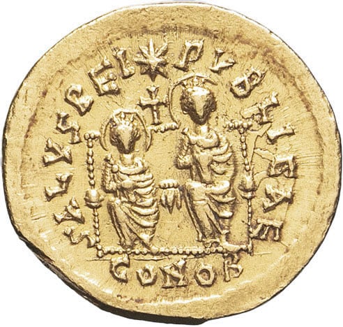 Rv. SALVS REI - PVBLICAE (officine)/ CONOB. Les deux Empereurs couronnés et nimbés, assis de face sur un trône, tenant chacun la mappa, une croix au-dessus et une étoile en haut.