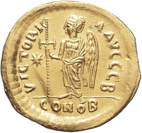 Rv. VICTORI - A AVCCC (officine) / CONOB. Victoire debout de face, tenant un globe crucigère de la main gauche et une longue croix de la main droite ; une étoile dans le champ à gauche.