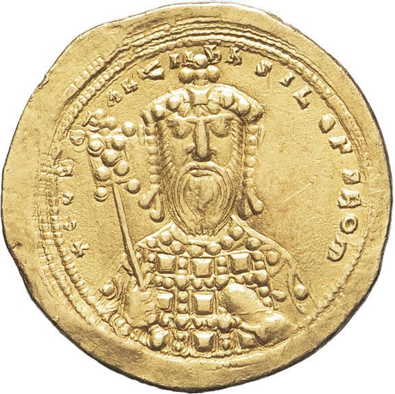 Rv. + CWNSTANTIN BASILE:YS ROM. Buste de face de Constantin VIII à la barbe longue, portant le stemma, vêtu du clapotos loros avec le maniakion, tenant le labarum et l’akakia.