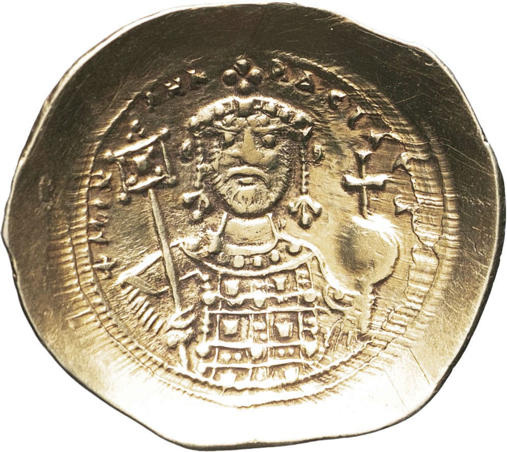 Rv. Buste de face de Michel VII barbu portant le stemma, vêtu du clapotos loros, avec le maniakion orné de six perles. En main droite le labarum et en main gauche le globe crucigère.